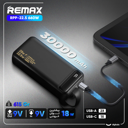 پاوربانک 22.5 وات ریمکس مدل RPP-660 ظرفیت 30000 میلی آمپر ساعت